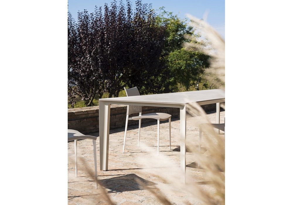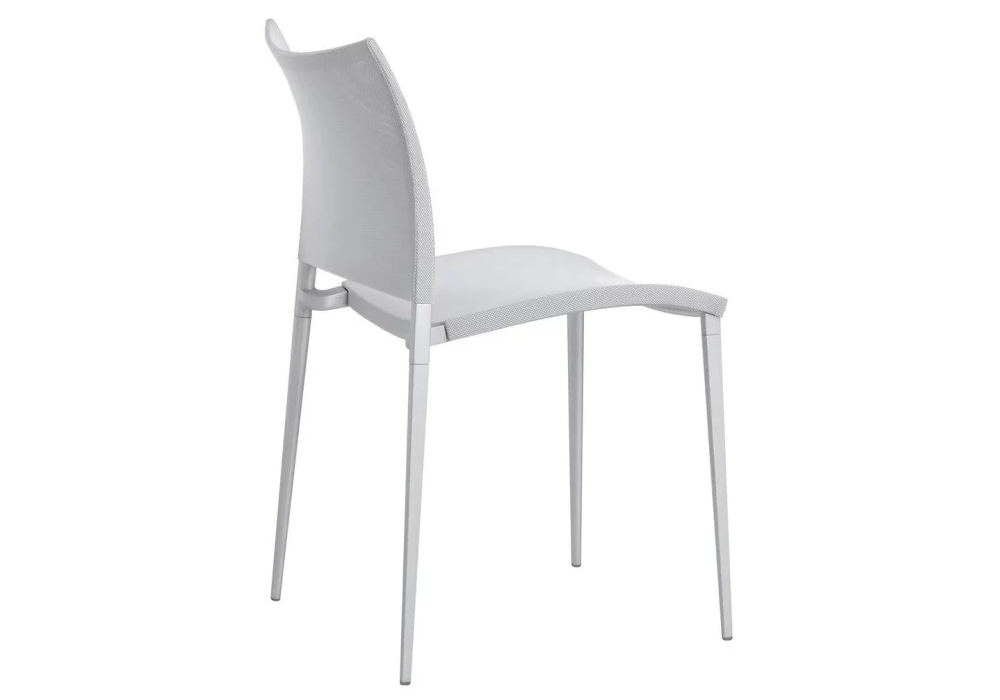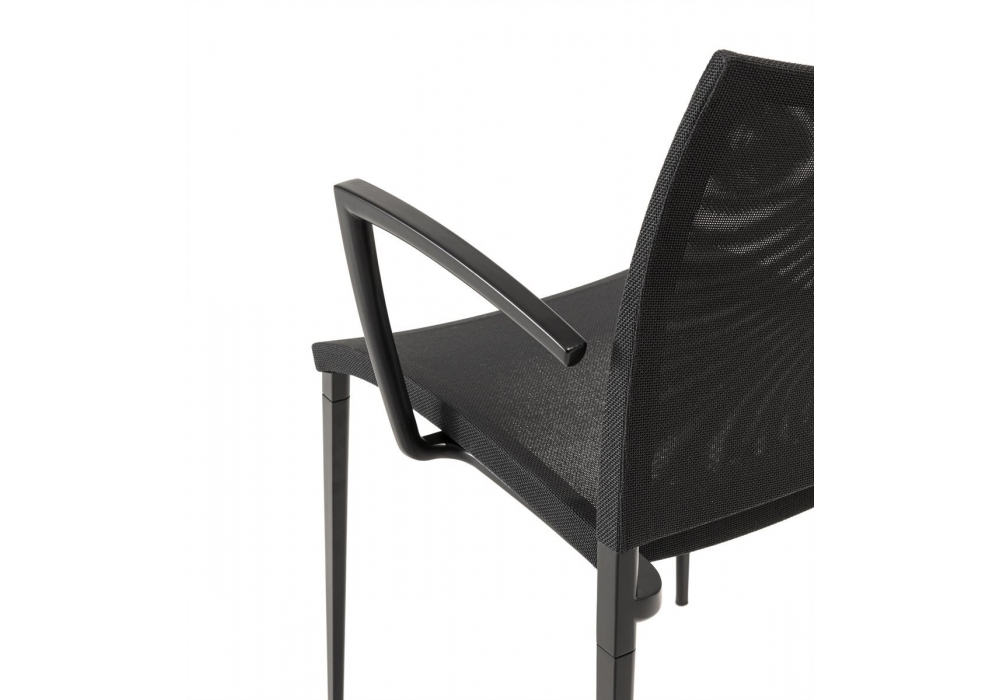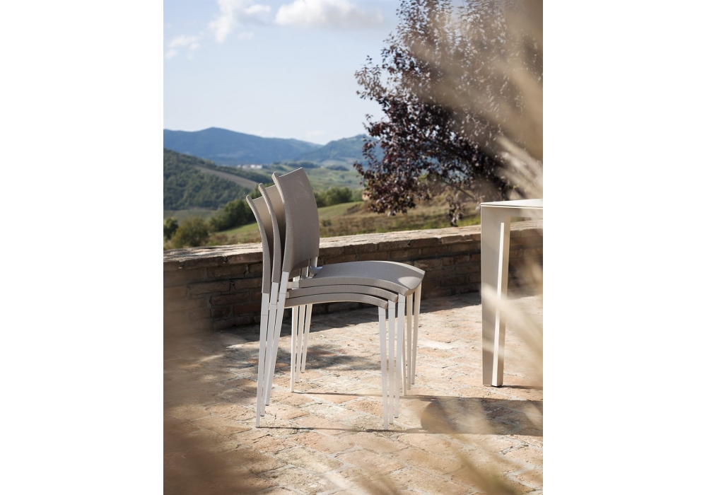 Sand Air Outdoor diseñada por Pocci e Dondoli para Desalto es una silla apilable con estructura de aluminio inyectado. Asiento y respaldo en malla de poliéster revestida de PVC (en la versión Canatex la malla está revestida de PVC y cáñamo). Disponible en diferentes acabados y en la versión con o sin reposabrazos.