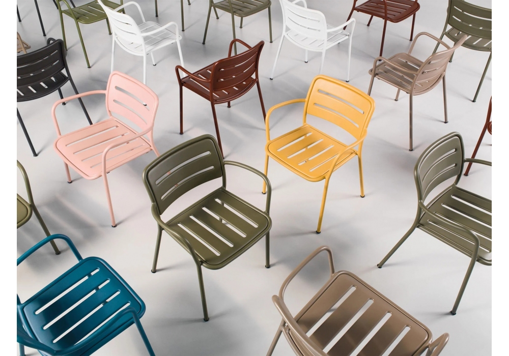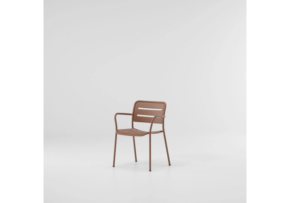 Village diseñada por Jasper Morrison para Kettal es una silla con brazos estructurada en aluminio tubular pintado. El asiento y el respaldo están realizados con una placa de aluminio perforada y perfilada. Village está disponible en diferentes acabados.