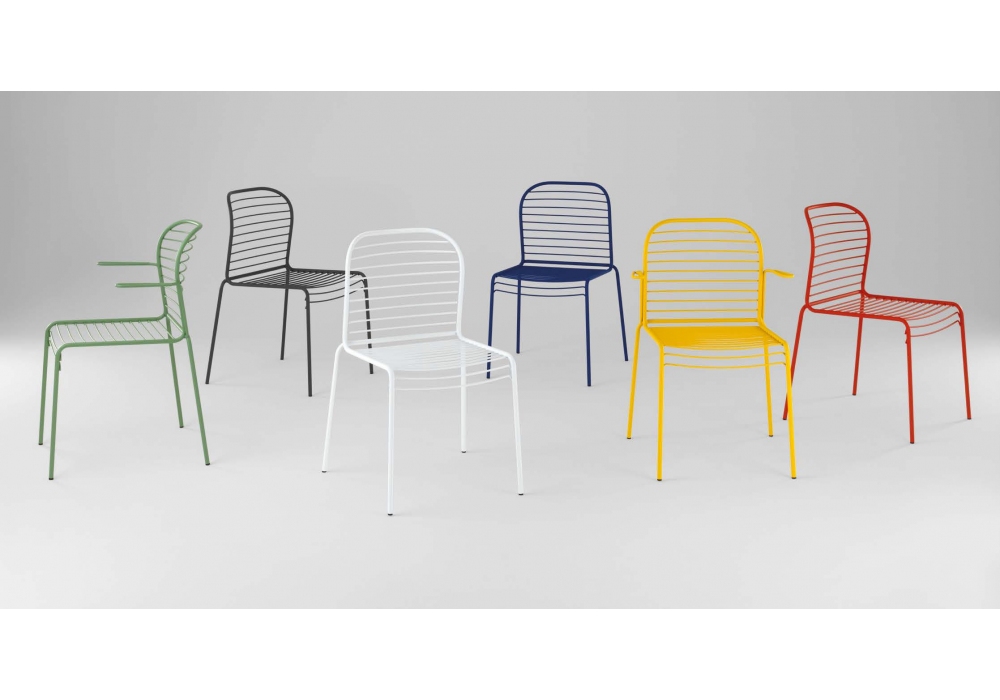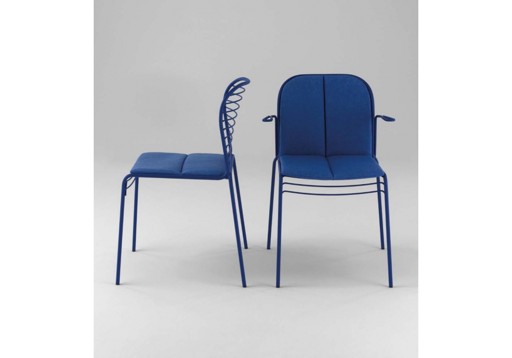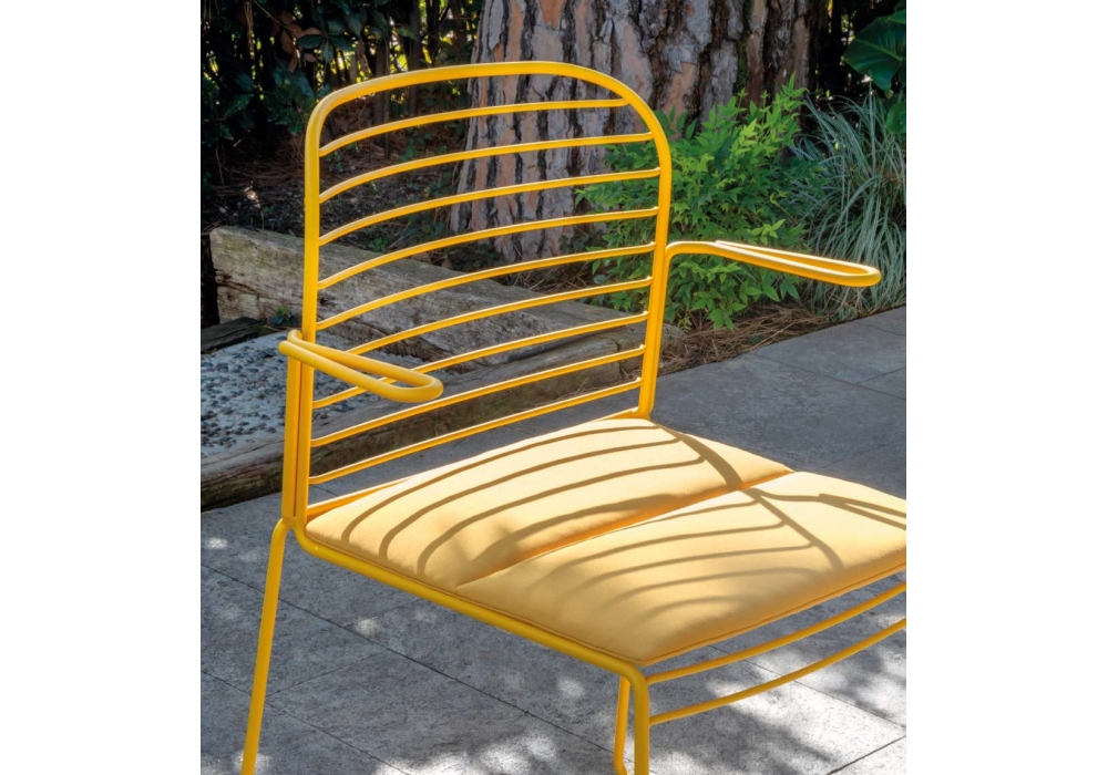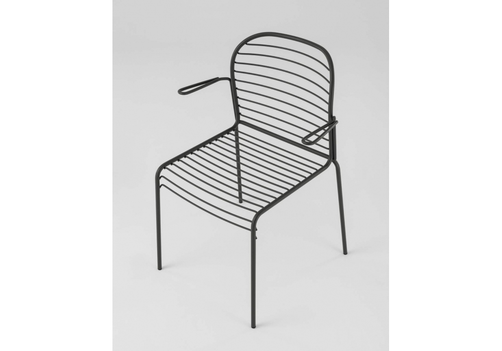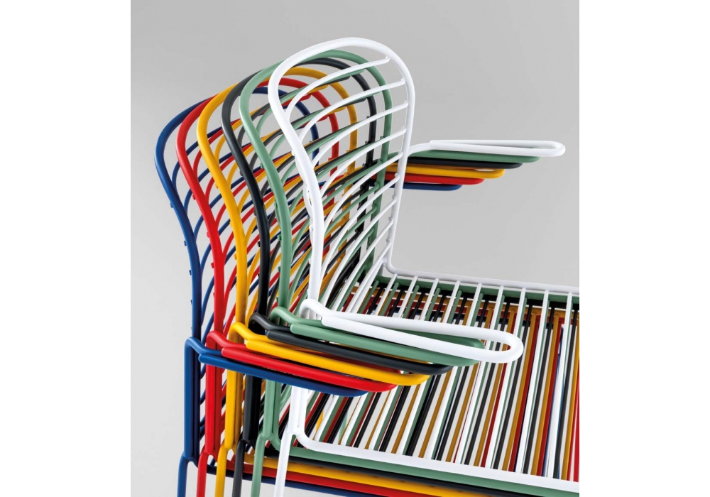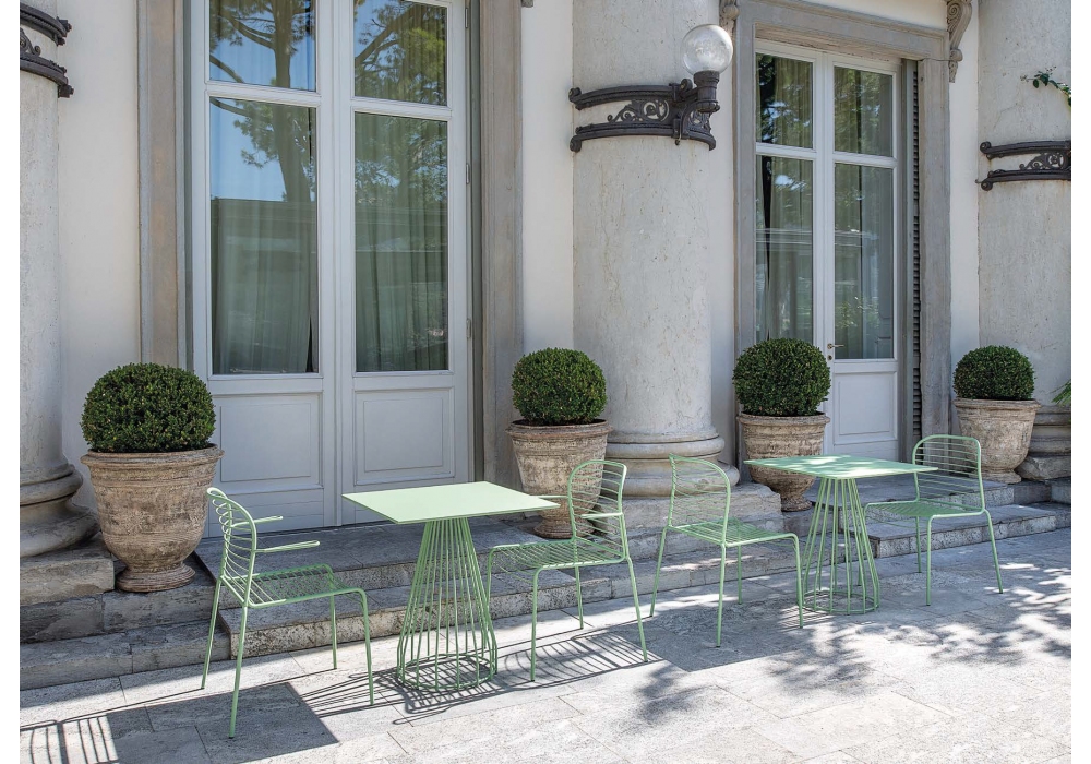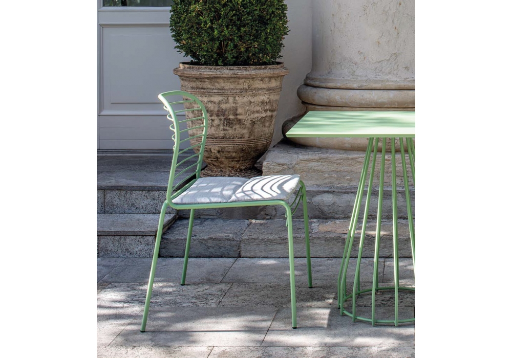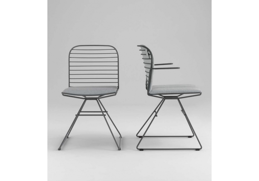 Infinito diseñada por Basaglia + Rota Nodari para Milani es una silla con o sin reposabrazos realizada con estructura de varilla de acero. Tratamiento protector para exteriores, polvos epoxi, acabado gofrado. Disponible en diferentes acabados y modelos. Cojín de tela disponible bajo pedido.