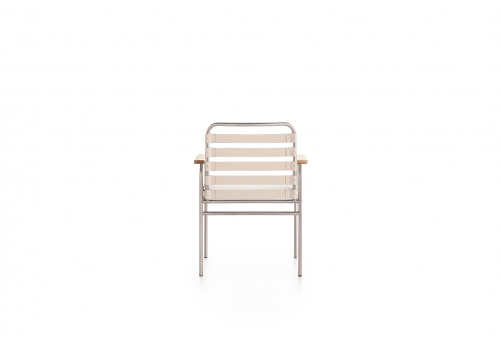 Onsen Silla diseñada por Francesco Meda y David Quincoces para Gandia Blasco es cuenta con una estructura de acero inoxidable con reposabrazos de madera de iroko. Cojines incluidos. Disponible en diferentes acabados.