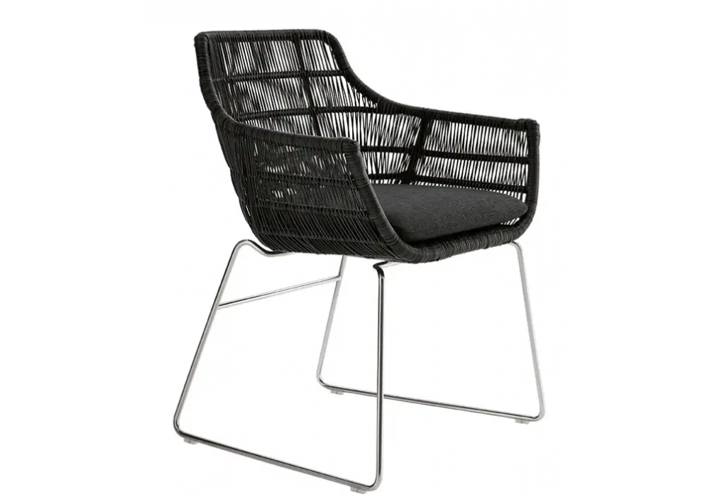 Crinoline diseñada por Patricia Urquiola para B&B Italia Outdoor es una silla con apoyabrazos, estructura en aluminio barnizado en polvo poliéster tortora, trenzado en polietileno tortora y base en acero inoxidable. Cojín asiento con revestimiento en tejido.
