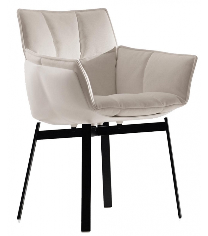 Husk diseñada por Patricia Urquiola para B&B Italia Outdoor es una silla con base de aluminio pintado blanco o negro, carcasa de Baydur® blanco y revestimiento en diferentes tejidos.