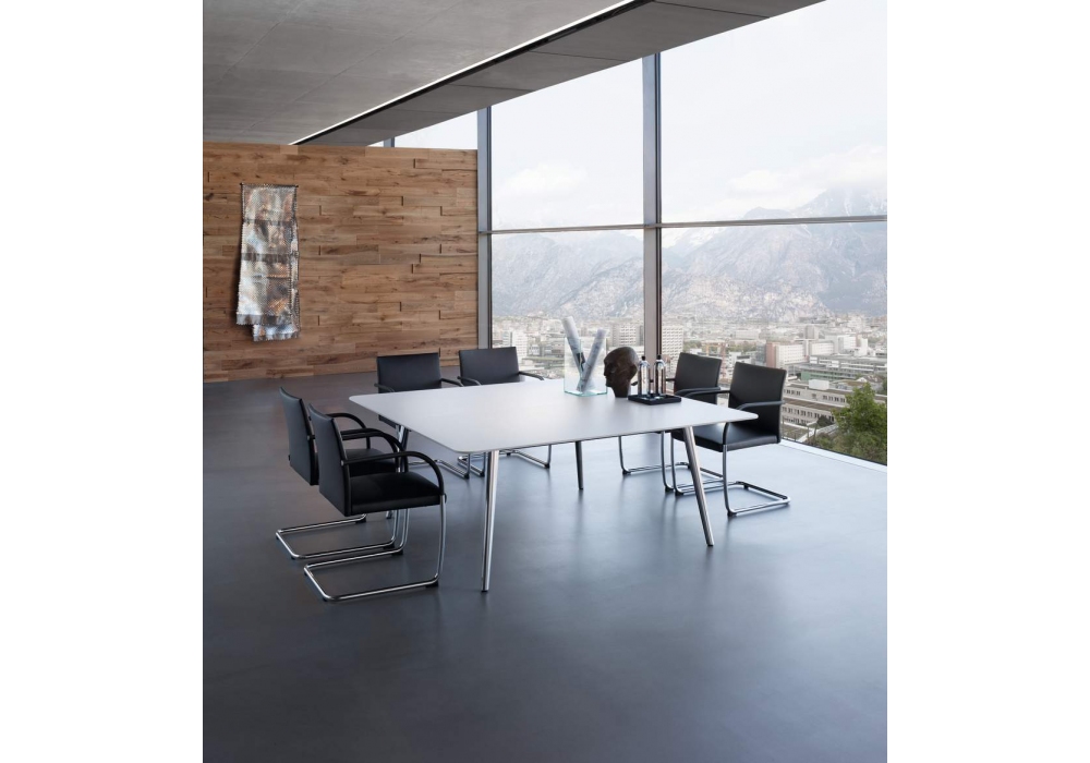 George diseñada por Eoos para Walter Knoll es una silla con reposabrazos tapizados en el mismo material de revestimiento o en cuero Select negro. Base en tubo de acero cromado pulido. Disponible en dos alturas, con o sin asiento y cojín de respaldo.