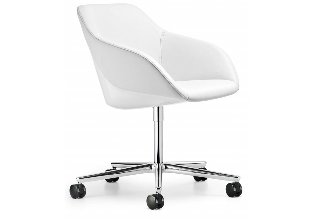 Turtle diseñada por PearsonLloyd para Walter Knoll es una silla giratoria con ruedas con base de 5 radios y carcasa exterior en blanco, negro, plástico o en el mismo material de revestimiento, disponible en tejido o piel.