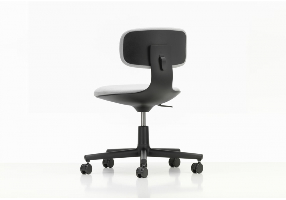 Rookie diseñada por Konstantin Grcic para Vitra es una silla giratoria con carcasa y base a cinco radios realizada en poliamida en colores soft grey o deep black; ruedas dobles (Ø 60 mm) en basic dark. Revestimiento disponible en tejido o cuero. Altura ajustable.