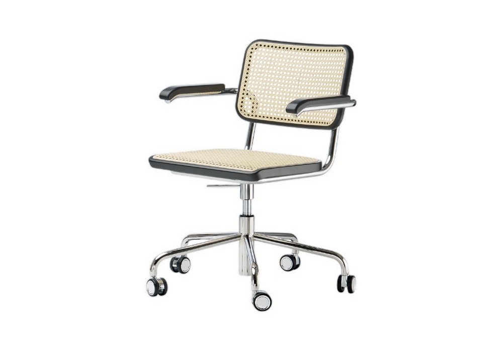 S 64 VDR diseñado por Marcel Breuer, Artistic copyright Mart Stam para Thonet es un sillón giratorio con estructura en acero tubular, cromado o lacado en diferentes colores. Elementos de madera en haya teñida. Asiento y respaldo en mimbre con tejido de refuerzo sintético. Altura ajustable. Con ruedas negras (estándar) o cromadas.