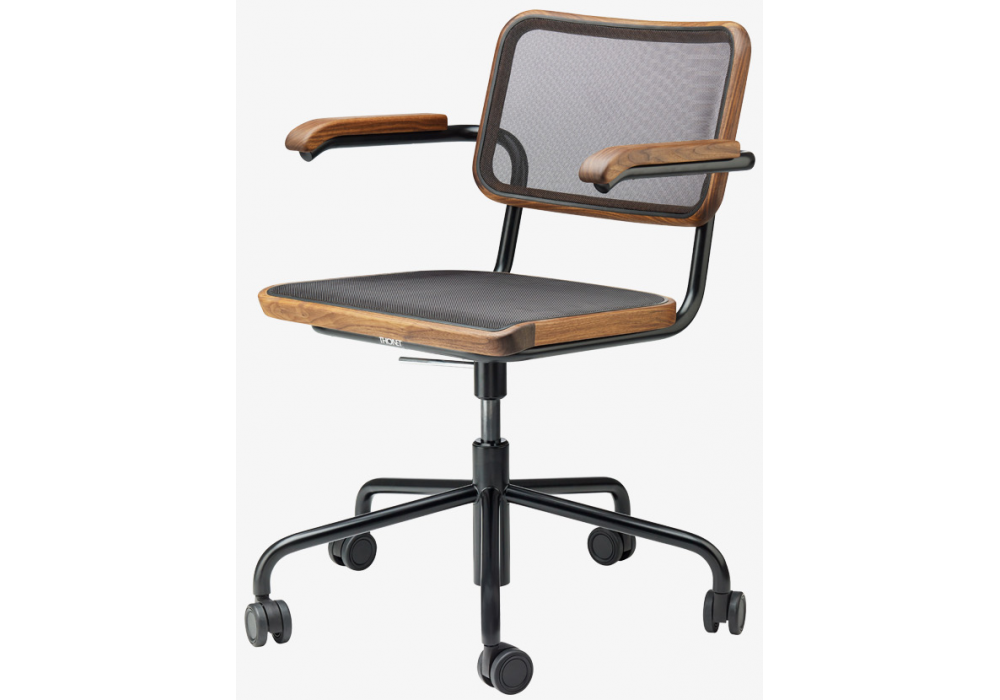 S 64 NDR diseñado por Marcel Breuer, Artistic copyright Mart Stam para Thonet es un sillón giratorio con estructura en acero tubular, cromado o lacado en diferentes colores. Elementos de madera en haya teñida. Asiento y respaldo en malla de material plastico. Altura ajustable. Con ruedas negras (estándar) o cromadas.