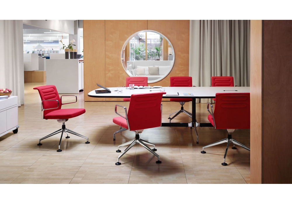 AC 5 Meet diseñado por Antonio Citterio para Vitra es una silla de conferencia giratoria. La cubierta del asiento y el respaldo es de tela o cuero y la base de cuatro estrellas en aluminio fundido a presión en los corredores. Disponible con y sin reposabrazos. Las medidas están de acuerdo con EN 1335-1.
