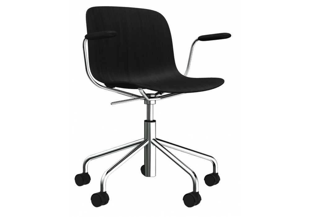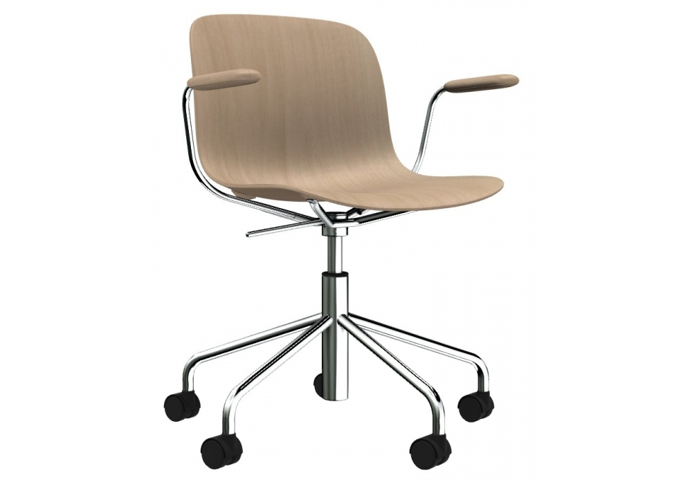 Troy 5 Star Wheels Beech diseñada por Marcel Wanders para Magis es una silla giratoria de 5 ruedas con asiento y reposabrazos en contrachapado de haya, regulable en altura con pistón de gas. Estructura en tubo de acero cromado o pintado. Disponible en diferentes acabados.