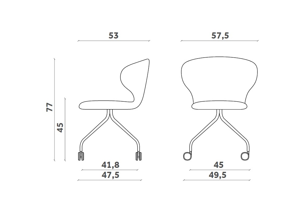 Mula Office diseñada por E-ggs para Miniforms es una silla con base de araña con ruedas, carcasa en poliuretano flexible estampado en frío revestido de tejido. Disponible en diferentes acabados.