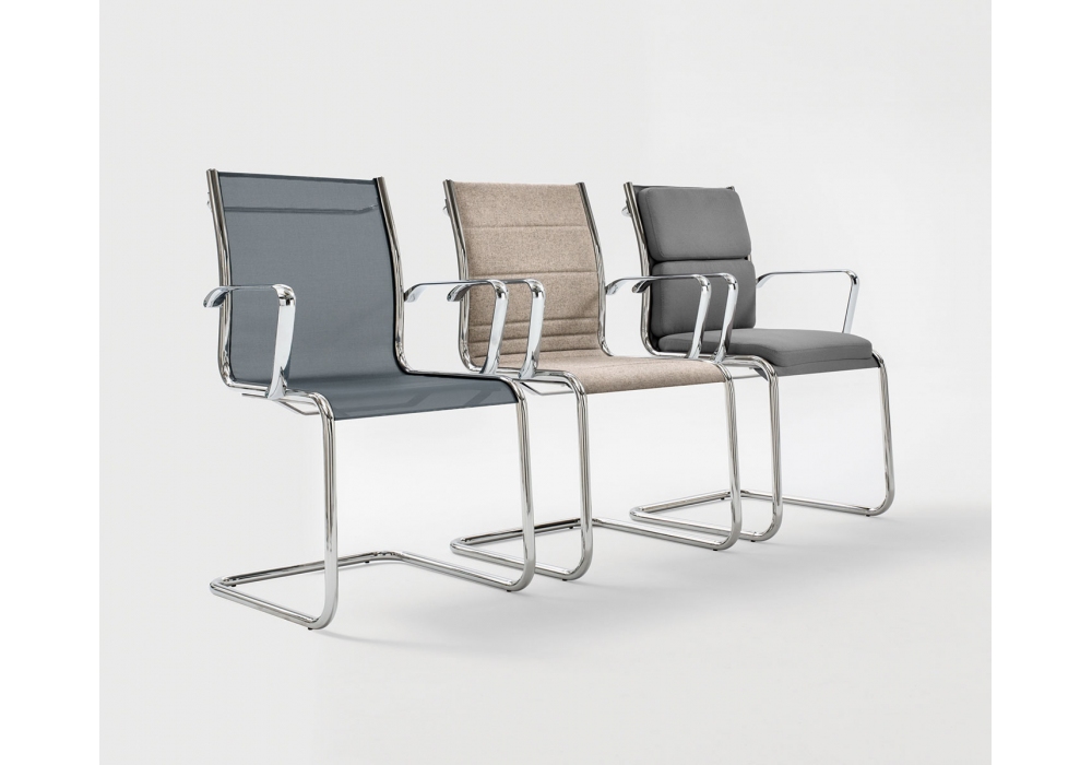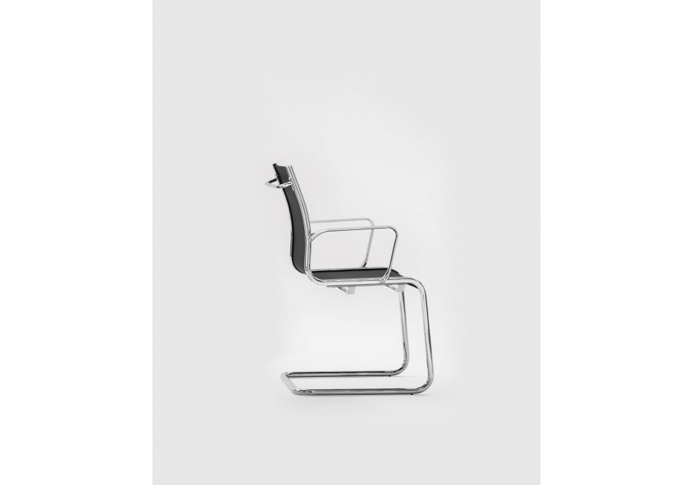 Sky Mesh diseñada por R&D Milani es una silla de visitante realizada con asiento y respaldo en malla RT, estructura de metal cromado sin tornillos laterales. Base de trineo en metal.