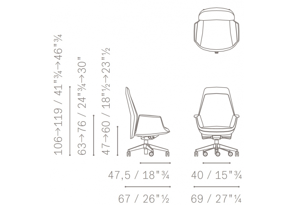 In the President, Executive, Managerial and Meeting versions, the five-spoke resting base, available in either polished aluminium or with a black finish, is fitted with soft, self-blocking “W” type wheels that adapt to all types of flooring. The Visitor version has a 4-spoke base with swivel plastic glides that are, on request, also available for the other versions. The President, Executive and Managerial versions are height adjustable and rotate by pulling the lever beneath the seat on the right. The “Syncron” turning mechanism for the seat and backrest allows the armchair to easily accompany the body’s movements, thereby guaranteeing extraordinary comfort. The armchair’s mechanism allows it to be locked into 4 different positions. To turn, sit on the chair and pull the lever beneath the seat on the left-hand side, pushing back on the backrest to unblock the chair. Use the knob located in the centre, underneath the seat, to adjust turning strength: by turning clockwise, resistance increases and by turning anti-clockwise it will lessen. To block the backrest in the desired position, press the left-hand lever once again. A thrust-bearing mechanism allows Downtown Meeting to rotate around its axis. Downtown Visitor is fitted with an automatic return rotation mechanism provided by a resistant bearing, which allows the armchair to rotate and return to its original position.
