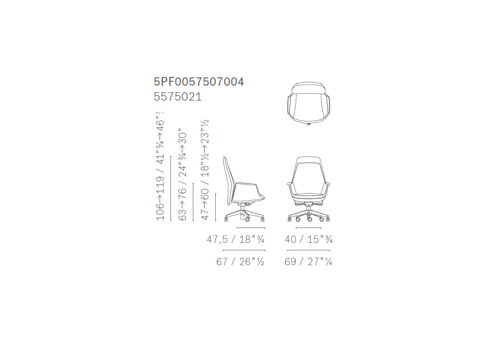 Downtown Executive diseñada por Jean Marie Massaud para Poltrona Frau es una silla de oficina giratoria con estructura de espuma de poliuretano moldeada, inserto metálico y acolchado de densidad variable con guata de poliéster. La base de cinco radios está disponible en aluminio pulido o pintado de negro, con ruedas o deslizadores suaves con autofreno. El tapizado está disponible en piel Pelle Frau® ColorSphere® (también disponible con partes microperforadas bajo pedido) o tela. Ofrece rotación de 360°, ajuste de altura del asiento y un mecanismo sincronizado de inclinación y oscilación del respaldo con ajuste de resistencia. Las costuras tono sobre tono le dan un toque distintivo.