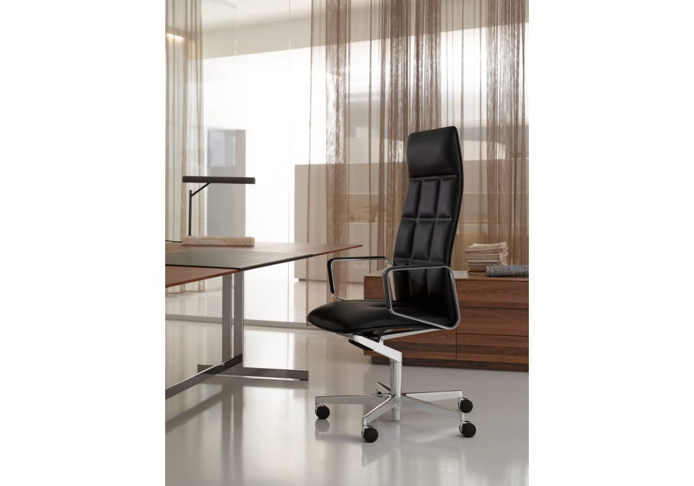 Leadchair Executive diseñado por Eoos para Walter Knoll es un hermoso sillón con base giratoria a 5 radios sobre ruedas, reposabrazos y respaldo disponible en 3 diferentes versiones. Mecanismo de regulación de altura. Revestimiento disponible en diversos tejidos o pieles. Con ruedas blandos para moquette o ruedas duras para suelos duros.