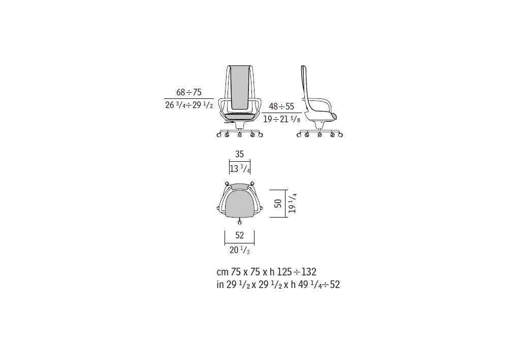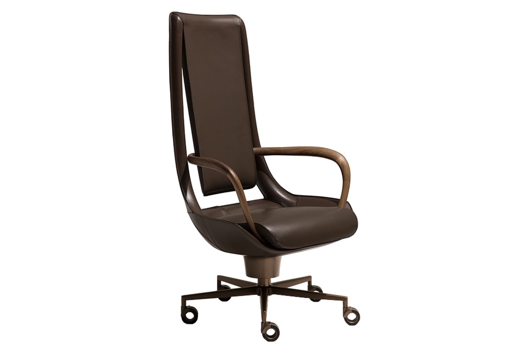 Clip diseñado por M2Atelier para Giorgetti es un sillón ejecutivo con estructura de respaldo en acero perfilado, asiento en Polimex y apoyabrazos en madera maciza de nogal canaletto. El acolchado es en poliuretano expandido. Base giratoria con ruedas giratorias, resorte de gas para regulación de altura y mecanismo de inclinación. Las ruedas, la base y la estructura son barnizadas en color bronce con efecto natural. El revestimiento, no desmontable, es disponible en cuero o piel.