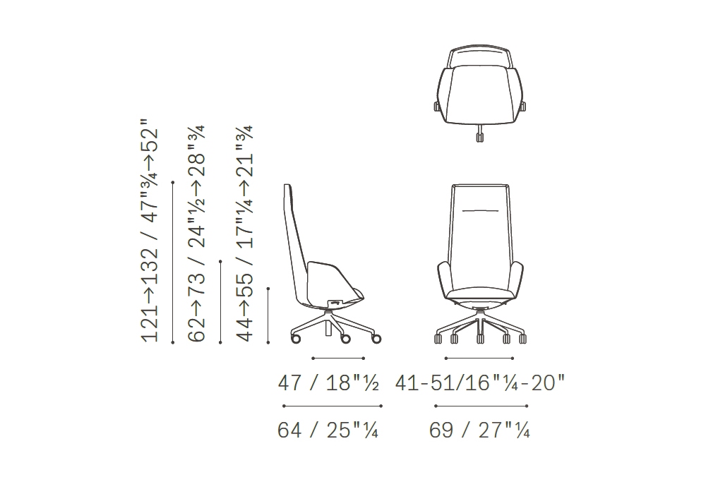 Cercle President diseñado por Lievore, Altherr y Park para Poltrona Frau es un sillón de oficina con estructura de poliuretano con inserción de metal. La estructura está acolchada con poliuretano de densidad diferenciada y tapizada con piel Pelle Frau ColorSphere® o en la versión que combina la piel o montura de la calota con la piel o tela de la superficie interior del asiento. Base de cinco radios con columna y ruedas blandas o duras disponibles en acabado negro o cromado.