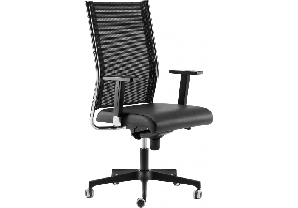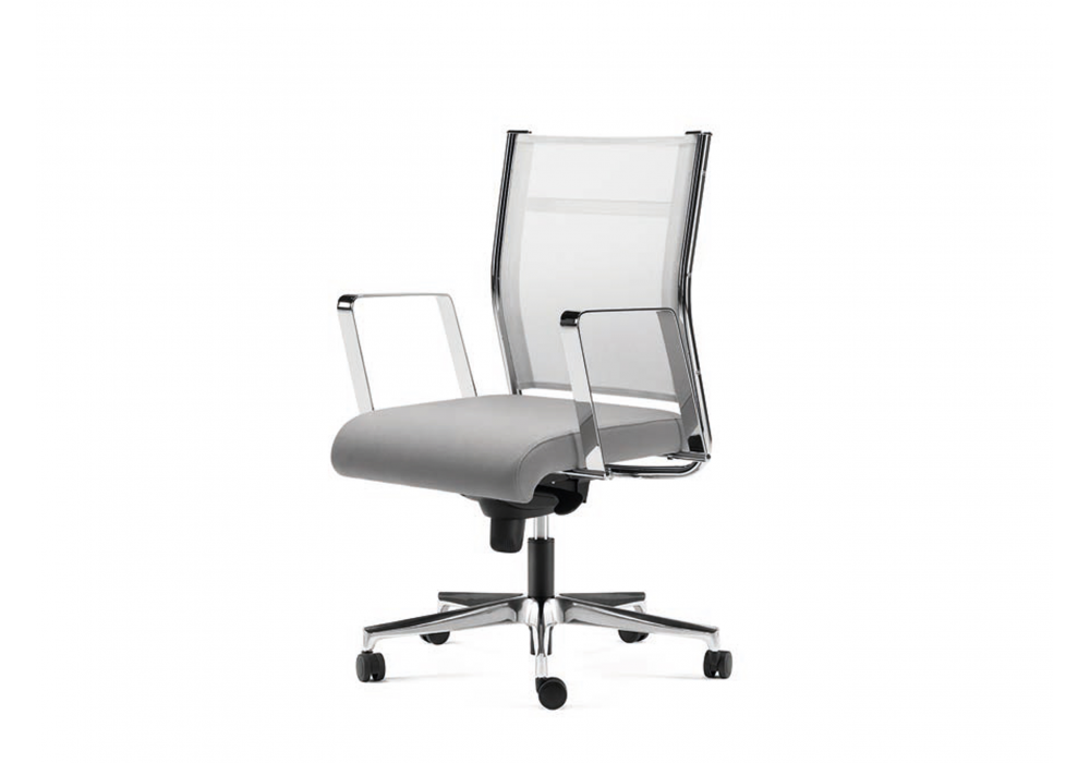 Syncronet diseñada por R&D Sitlosophy para Sitlosophy es una butaca con asiento en contrachapado prensado, respaldo en acero cromado con rejilla portante y brazos fijos en acero cromado, regulables en altura, con almohadilla deslizante de polipropileno. Relleno de espuma de poliuretano flexible revestido de diferentes pieles, ecopieles o tejidos.