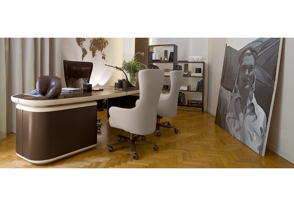 Genius is an armchair designed by Roberto Lazzeroni for Giorgetti. Armchair with the structure of the back in profiled steel and the seat in poplar plywood. The padding is in flexible coldfoamed polyurethane covered with fibre. The armchair have a 5 point revolving base, rotating castors, gas spring for height regulation and a tilting mechanism for positioning. The wheels, the base and the connection between the base and the seat are painted in a bronze colour with natural effect. The not removable upholstery is available in fabric or leather in one colour.