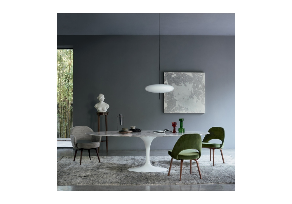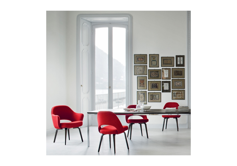 Saarinen diseñado por Eero Saarinen para Knoll es un sillón de dirección con patas en acero cromado pulido, pintado de negro o madera en varios acabados. Tapizado en tela o piel.