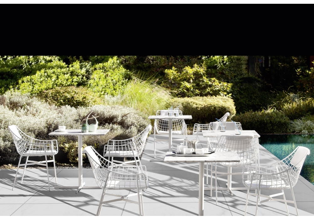 Summer Set diseñado por Christophe Pillet para Varaschin es un sillón en acero con ciclo de protección C5M (que lo hace apto para uso en áreas marinas) y acabado en polvo. Disponible en diferentes acabados.