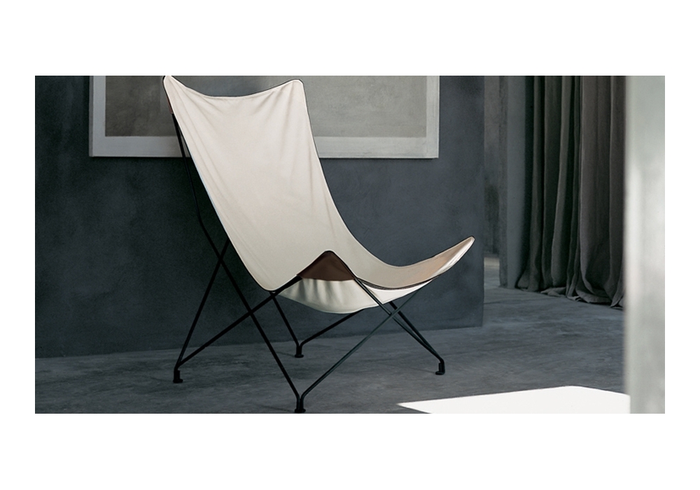Lawrence is an outdoor lounge chair designed by Rodolfo Dordoni for Roda. Essential design for Lawrence: a cotton impermeable canvas with leather inserts, clothes the vertexes of four structural triangles in metal wire. Available in sand, green or blue canvas, it is perfect both for indoor and outdoor spaces.