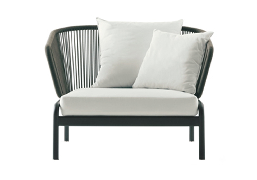 Spool is an outdoor lounge chair designed by Rodolfo Dordoni for Roda. A closely spaced succession of cords, embraced to a metallic tubular frame, with simple, sinuous lines that brings to mind weaving spools. Spool is a project that gives life to a new vibrant story, composed of weaves and attractive shadow effects, created by the light that filters from the sections of the backrest. The result is a collection with an explosive design, a perfect balance between strength and lightness, that doesn’t neglect of comfort of seating, that can accommodate an abundance of soft cushions. The outdoor varnished stainless structures are available in smoke with grey or olive cords and milk with sand or olive cords versions.