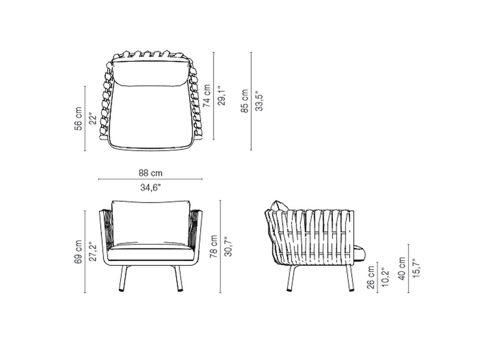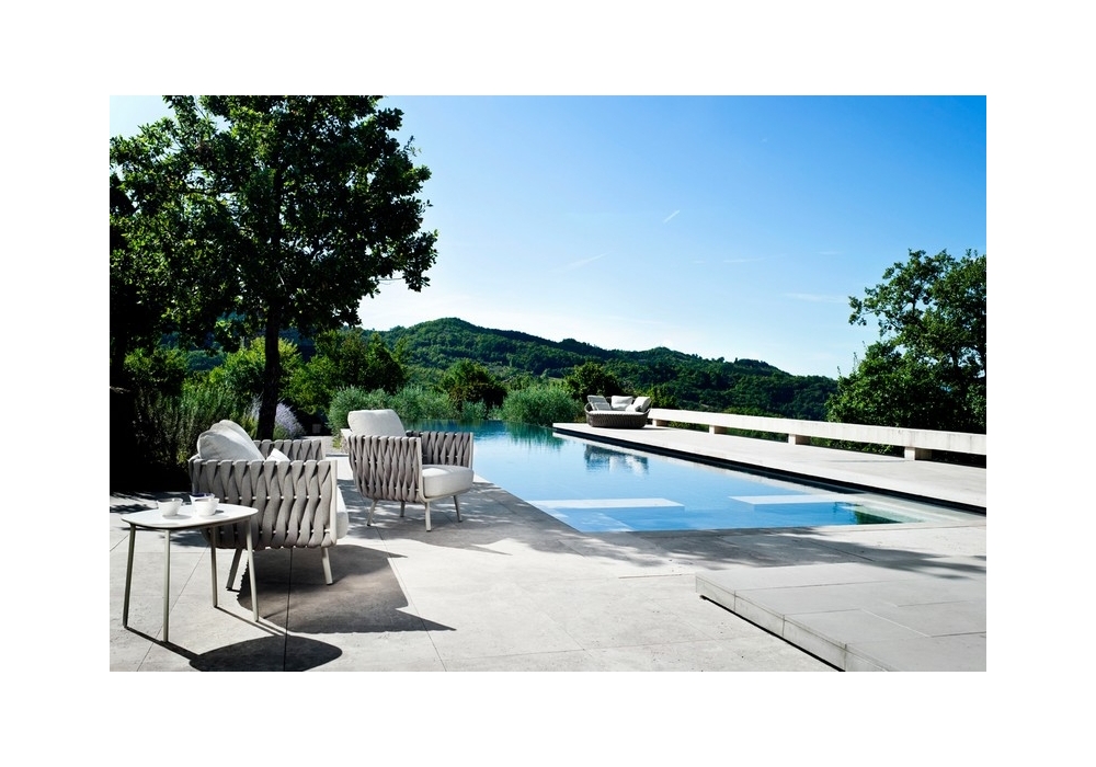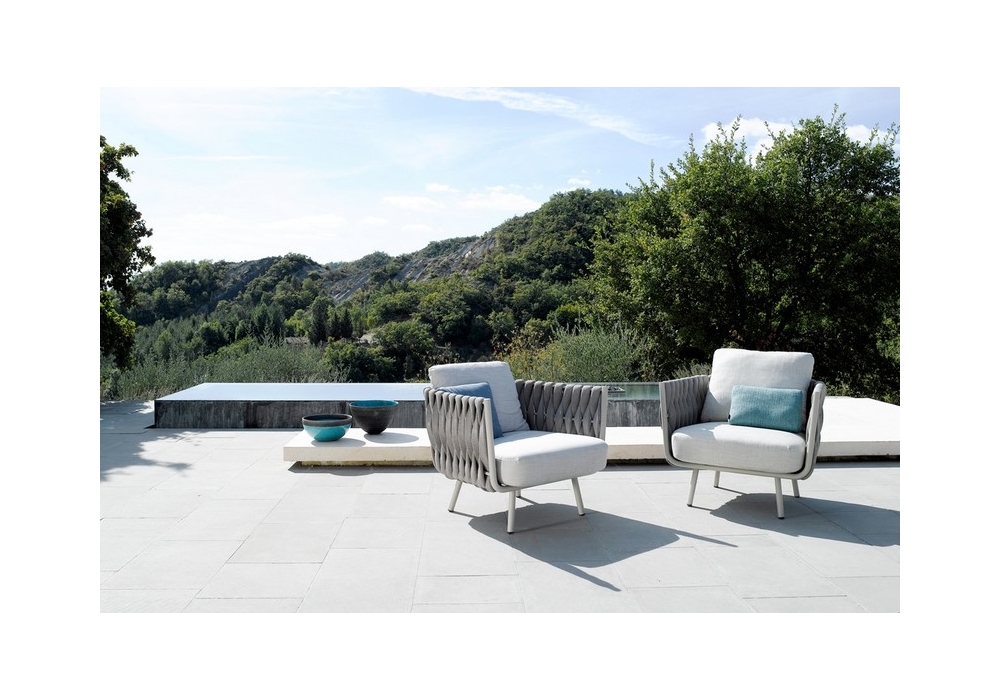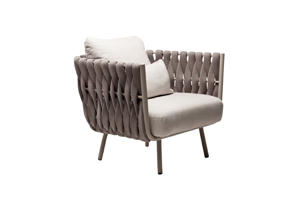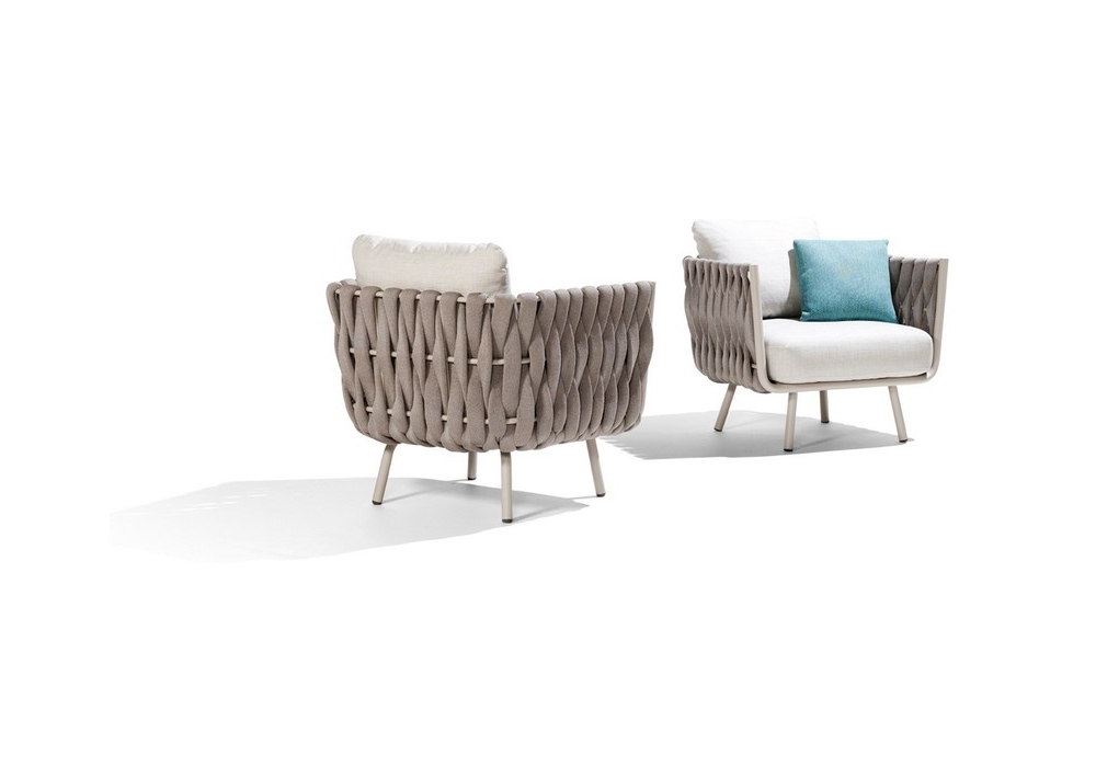 Tosca es una sillón firmada por Monica Armani para Tribù. La colección de muebles de exterior Tosca es cálida a la par que acogedora, elegante e intrigante. Era la primera vez que el fabricante belga de muebles de exterior Tribù trabajaba con una mujer para sus diseños. Feminidad y emoción fueron las palabras clave en el diseño de este exclusivo mobiliario de exterior, que se caracteriza por un asiento con un trenzado único extra ancho y vertical, soportado por finas patas acampanadas. El material utilizado para el trenzado se puede describir como innovador, sin más: espuma cubierta con una funda en forma de tubo tejida, sin costuras de textileno y poliolefina. Es material tiene un aspecto sorprendentemente natural, pero es 100% resistente a la intemperie. Gracias a los cómodos cojines de exterior, el confort de uso es muy agradable. Los suaves colores tono sobre tono en el lino hacen que destaque el carácter elegante de este lujosa sillón club.