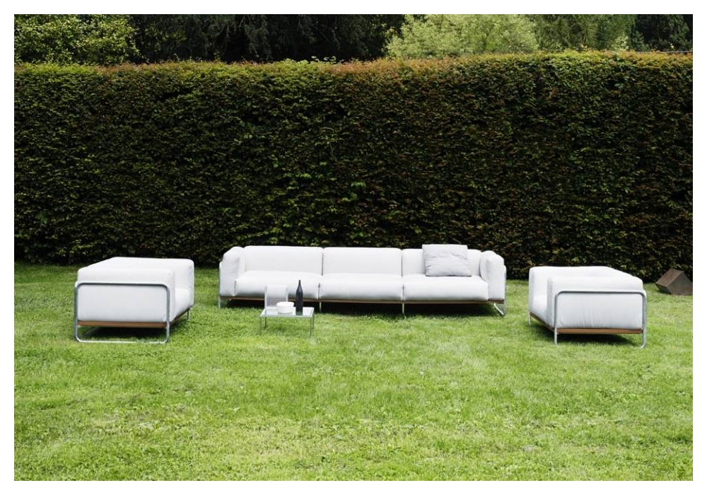 Filo Outdoor designed by Piero Lissoni for Living Divani is an armchair with a tubular steel frame supporting the shell at sight in Iroko wood, dominated by soft, cosy cushioning, covered in fully removable outdoor fabric. Seat depth 56cm.
