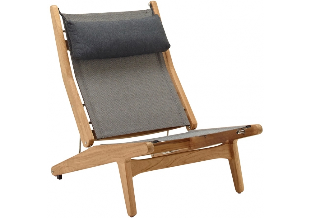 Bay diseñada por Henrik Pedersen para Gloster es una silla reclinable para exteriores con estructura de teca con acabado pulido y asiento y respaldo sling. Cojín reposacabezas de tela incluido.
