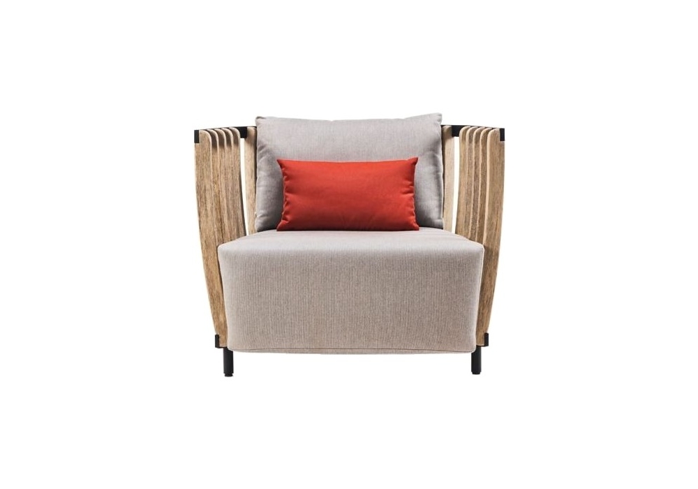Swing diseñada por Patrick Norguet para Ethimo es una butaca en teca y aluminio que incluye cojines de asiento y respaldo con tapizado en acrílico gris.