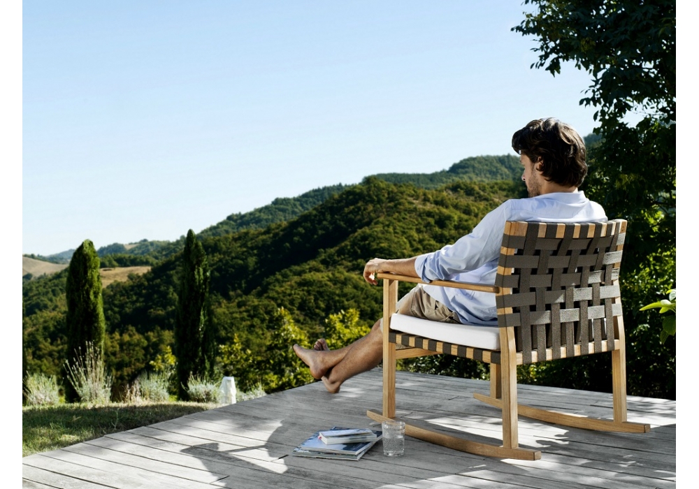 Vis à Vis diseñada por Piergiorgio Cazzaniga para Tribù es una mecedora con estructura en teca y asiento y respaldo en tejido Canax, resistente a la intemperie. El cojín del asiento está acolchado y tapizado en diferentes tejidos y colores. Es posible añadir un cojín lumbar, lo que hace que el asiento sea aún más cómodo.