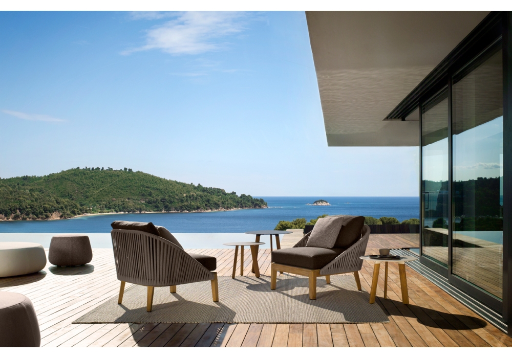 Mood diseñada por Studio Segers para Tribù es una butaca con estructura en teca y respaldo en aluminio con tejido Tricord (poliolefina), en diferentes colores. Los cojines del asiento y del respaldo están acolchados y tapizados en diferentes tejidos.