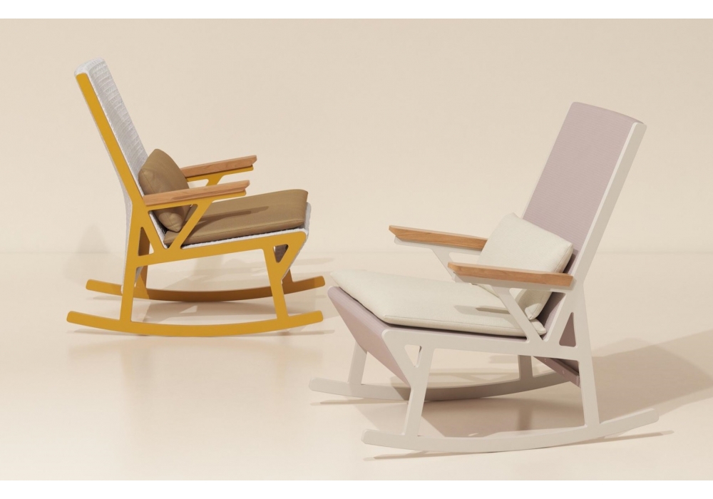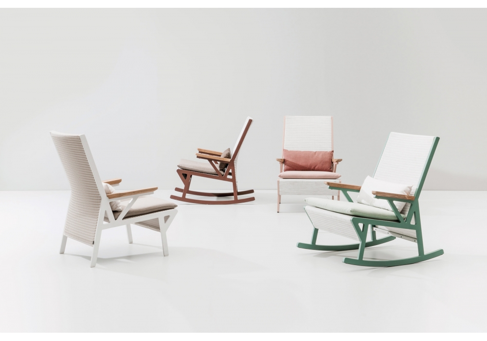 Vieques diseñada por Patricia Urquiola para Kettal es una mecedora que se caracteriza por la combinación de una estructura de aluminio con un revolucionario tejido tridimensional por excepcionales características técnicas, creado especialmente para esta colección y exclusivamente para Kettal.