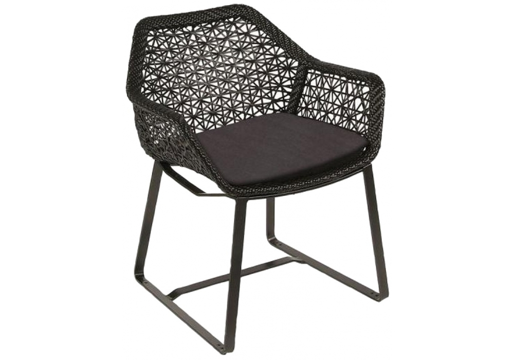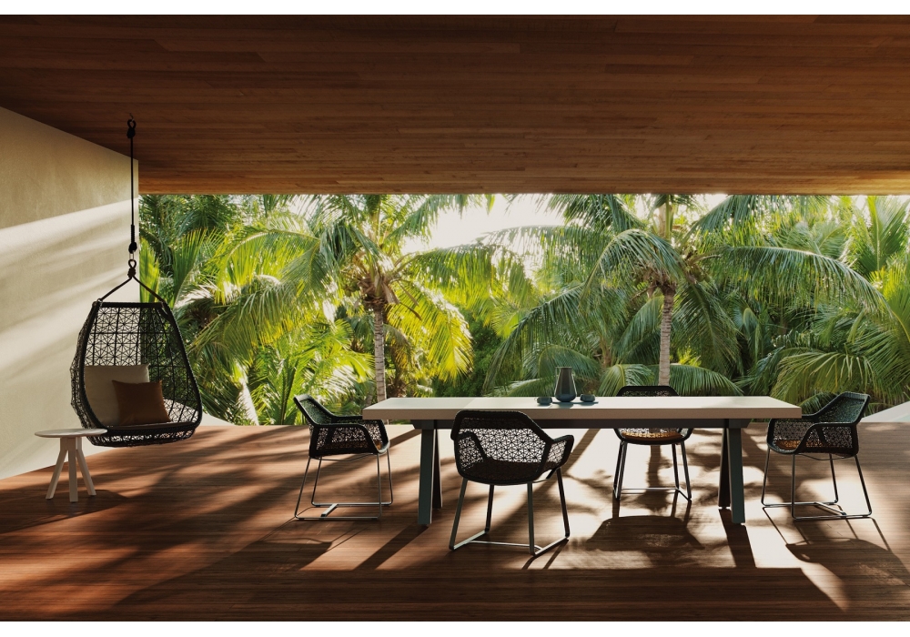 Maia diseñada por Patricia Urquiola para Kettal es una silla de comedor para exterior con estructura y patas de aluminio pintado. La carcasa es de aluminio recubierto de cuerda o fibra tejida. Los cojines están acolchados y recubiertos de tela. Maia está disponible en diferentes acabados.