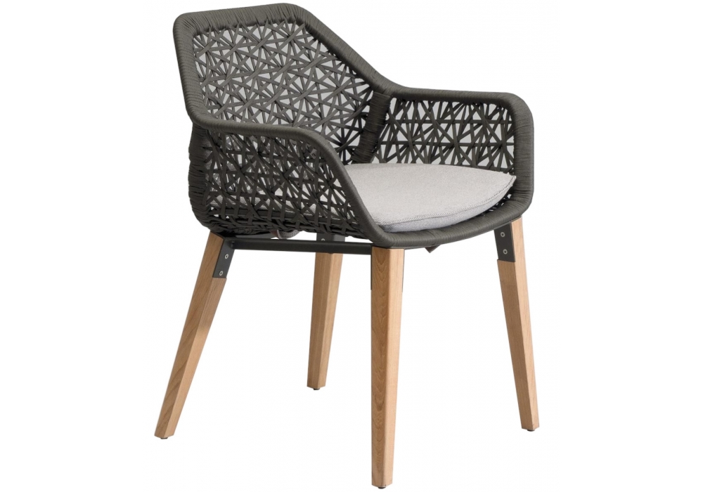 Maia diseñada por Patricia Urquiola para Kettal es una silla de comedor para exterior con estructura de aluminio y patas de madera de teca. La carcasa es de aluminio recubierto de fibra tejida o cuerda. Los cojines están acolchados y recubiertos de tela. Maia está disponible en diferentes acabados.