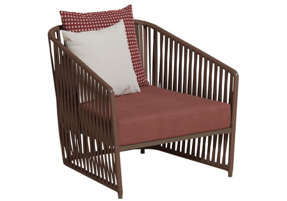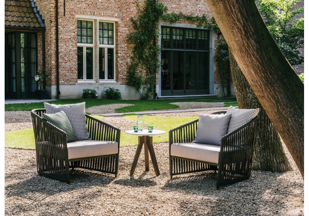 Bitta Lounge diseñada por Rodolfo Dordoni para Kettal es una silla de comedor con estructura de aluminio pintado. La carcasa está revestida de cuerda sintética con cojines acolchados y tapizada en tela apta para uso exterior. Botta está disponible en diferentes acabados.