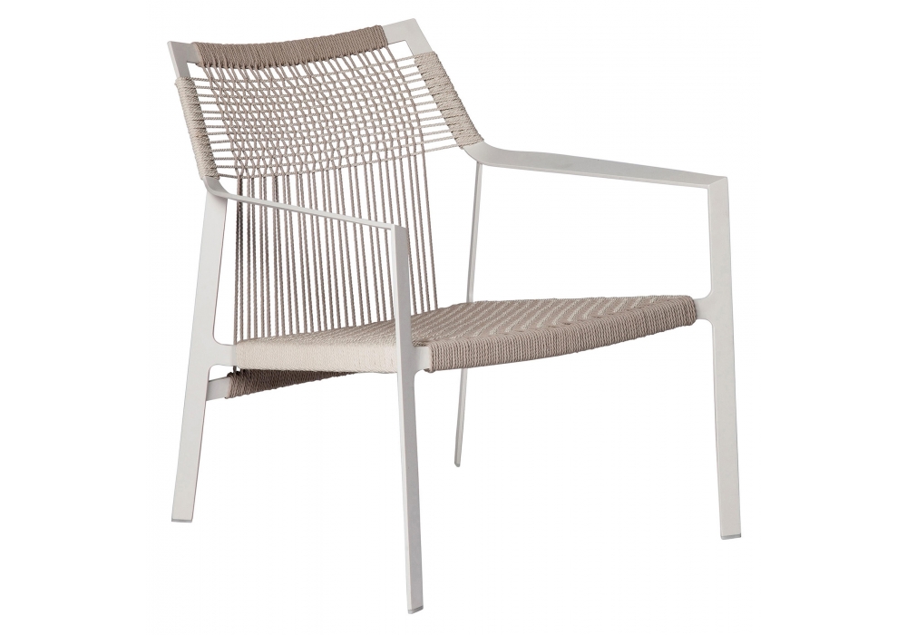 Nodi diseñado por Yabu Pushelberg para Tribù es un sillón con estructura en acero pintada con polvo blanco o wengé y asiento y respaldo realizados en cuerda trenzada.