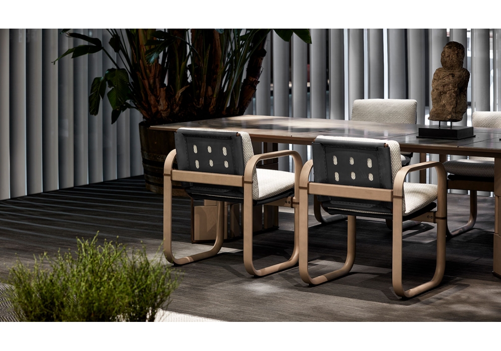 Loop diseñado por Ludovica & Roberto Palomba para Giorgetti es un silloncito con estructura en madera de fresno disponible en acabado arena (fin.3F) y aluminio protegido, barnizado en polvo color algarroba. El asiento y el respaldo son en EVA, polímero impermeable, disponible en los siguientes colores: blanco, arena, marrón oscuro, rojo ladrillo, azul bally, gris. Los cojines del asiento y del respaldo son en poliuretano expandido y fibra para exteriores con revestimiento impermeable. El revestimiento con tejidos de la colección Open-air es totalmente desmontable.