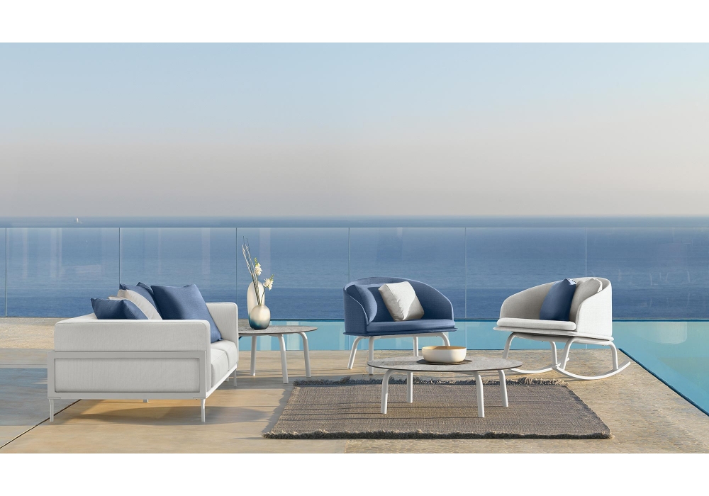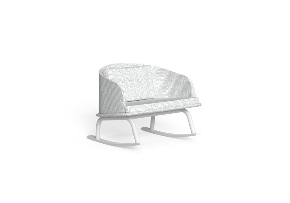 Cleosoft Alu diseñada por Marco Acerbis para Talenti es una mecedora realizada en aluminio, tapizada en tela, disponible en diferentes acabados.