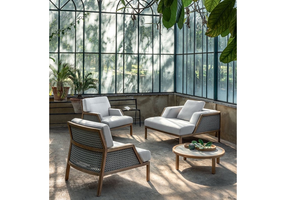 Grand Life diseñado por Christophe Pillet para Ethimo es un sillón bergère con estructura en teca y cuerda tejida. Los cojines del asiento y del respaldo están cubiertos con tela acrílica o cuerda. Grand Life está disponible en diferentes acabados y revestimientos.
