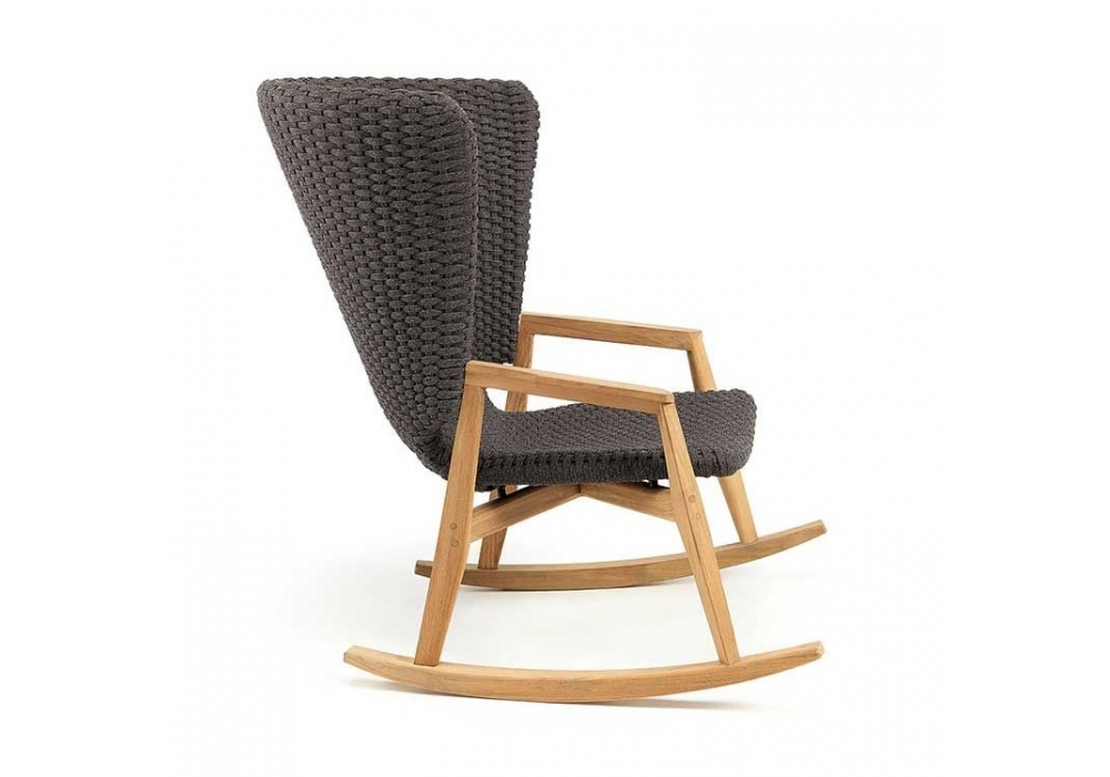 Knit diseñada por Patrick Norguet para Ethimo es una mecedora con estructura en madera de teca y tapizado en cuerda en diferentes acabados. Knit está disponible con o sin cojines lobulares.