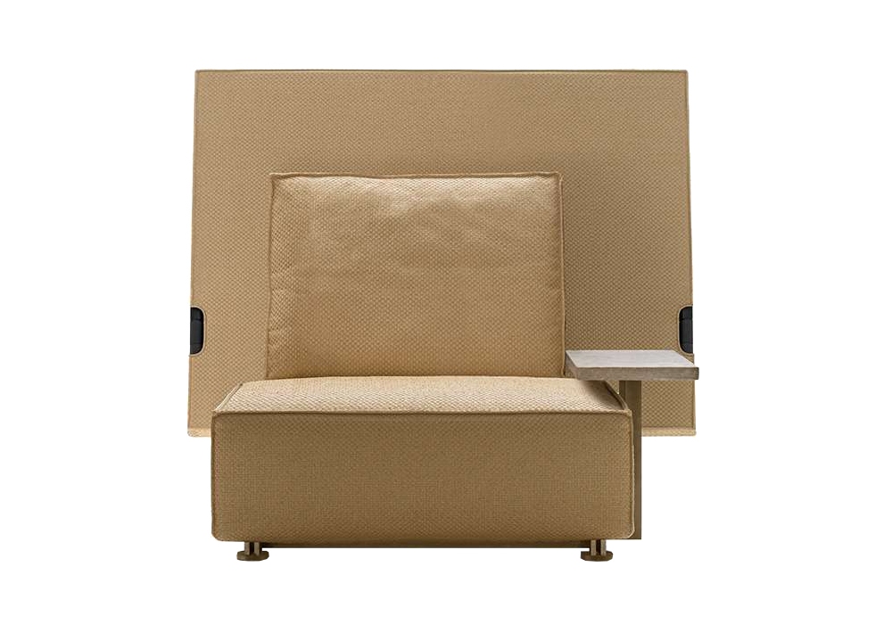 Oh, it rains! diseñada por Philippe Starck para B&B Italia Outdoor es una butaca de exterior con estructura de aluminio con acabado titanio y asiento de poliuretano conformado revestido de diferentes tejidos. Patas de aluminio con acabado bronce. Bisagras de aluminio anodizado en gris cálido. Mesa de centro con estructura de aluminio con acabado titanio y tablero de piedra mediterránea.