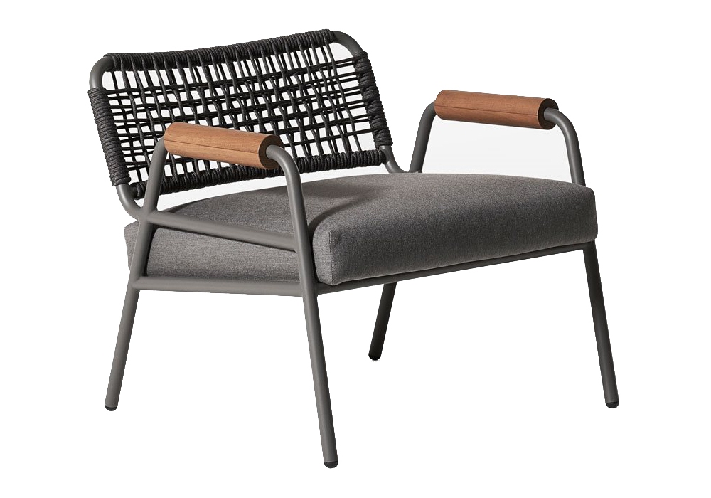 Zoe Wood diseñada por Andrea Parisio para Meridiani es una pequeña butaca con estructura de aluminio barnizado y cojín del asiento de poliuretano y fibra de poliéster con funda repelente al agua. Los acabados para respaldo y laterales están disponibles en polipropileno. La cuerda está tejida disponible en 4 acabados. Los reposabrazos están acabados con detalles en madera maciza de iroko. Disponible cojín de espalda o cojín lumbar.