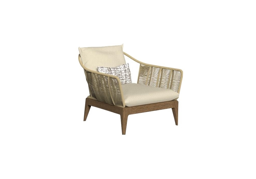 Cruise Teak diseñado por Ludovica y Roberto Palomba para Talenti es un sillón con estructura de madera, respaldo y reposabrazos en cuerda sintética y cojines con tela impermeable.