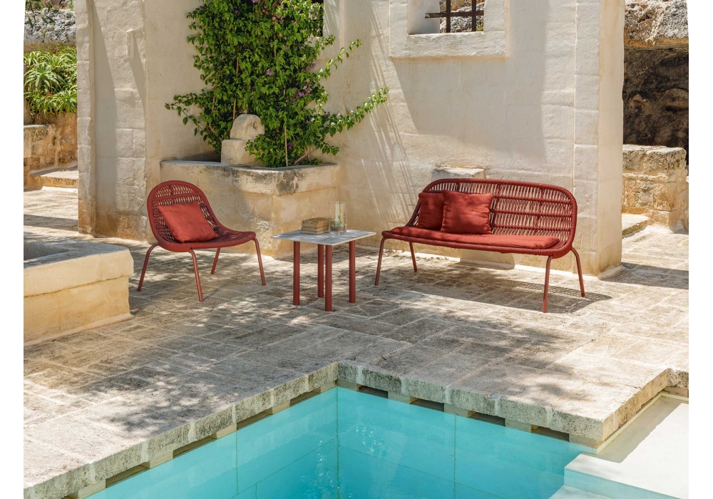 Panamá diseñado por Ludovica y Roberto Palomba para Talenti es un sillón con estructura de aluminio y cuerda náutica sintética disponible en varios colores, cojín de asiento y decoraciones opcionales en varios acabados.