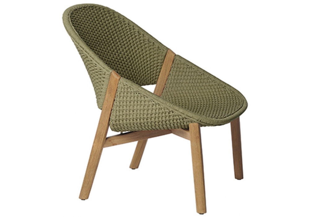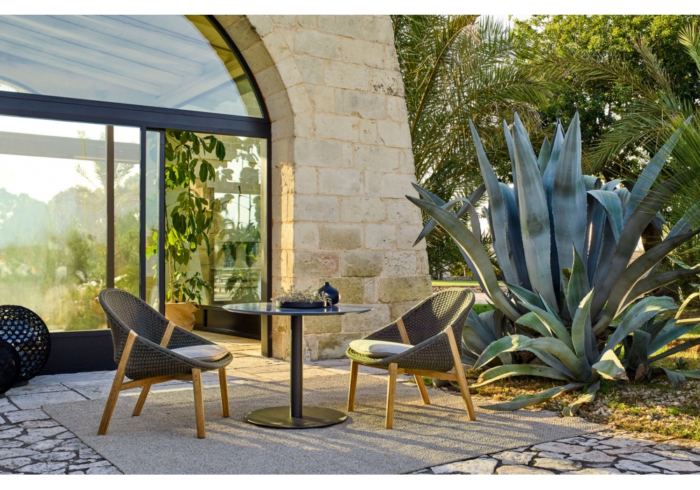 Elio diseñado por Yabu Pushelberg para Tribù es un sillón con estructura de teca y cuerpo trenzado en tricordón (poliolefina). Disponible en la versión con respaldo alto o bajo.