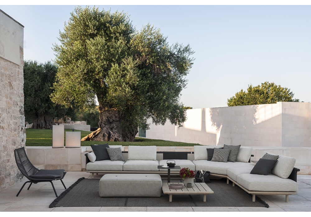 Laze diseñado por Gordon Guillaumier para Roda es un sillón de exterior de respaldo alto con estructura de acero inoxidable con recubrimiento en polvo y cuerpo compuesto por cordones de poliéster o acrílico.