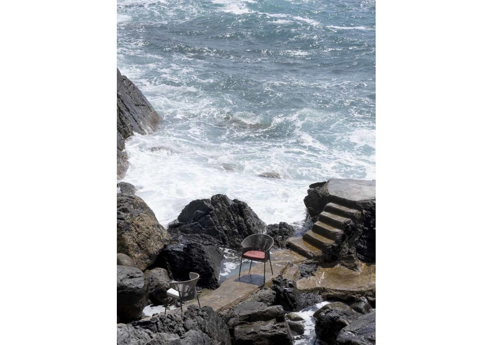 Ola diseñada por Radice Orlandini para Potocco es una butaca para exteriores completamente estructurada en metal pintado en diferentes acabados. El asiento y el respaldo están cubiertos con un tejido de cuerda Fly de 8 mm. Housse de coussin en différents tissus.