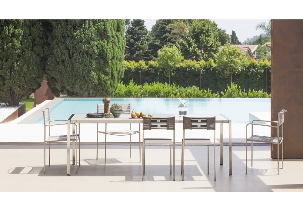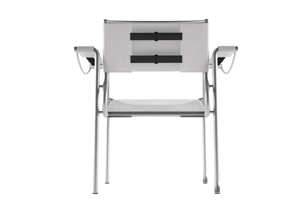 209 Green diseñada por Giandomenico Belotti es una butaca apilable para exteriores, con estructura de acero inoxidable cepillado; Asiento, respaldo y reposabrazos en malla de poliéster ignífuga recubierta de PVC.