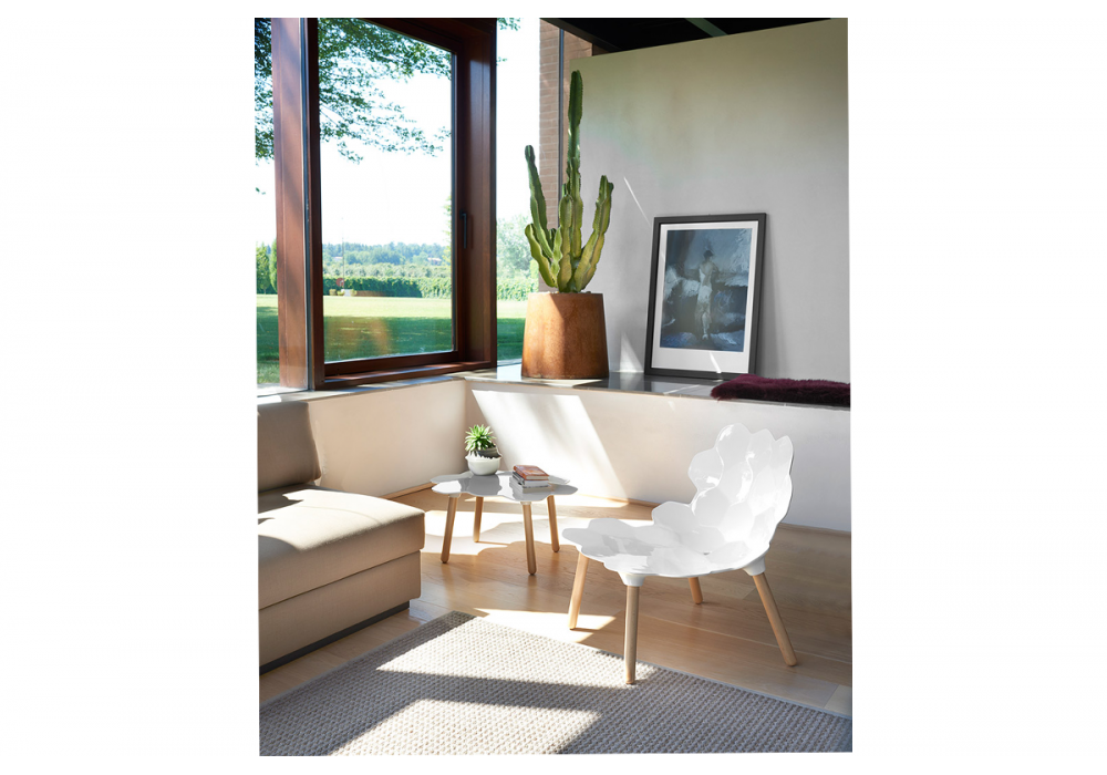 Tarta diseñada por Roberto Paoli para Slide es una butaca que recuerda al caparazón de una tortuga. La innovación de Tarta radica en la combinación inusual de dos materiales: poliuretano rígido, presentado en la versión lacada, y patas de madera. Disponible en diferentes acabados